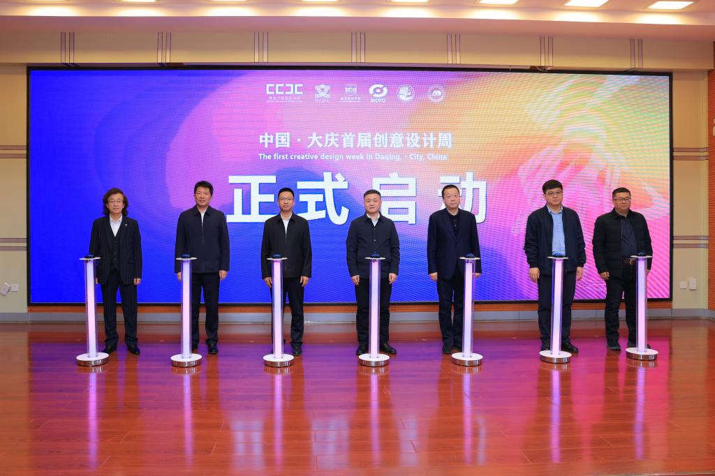 在与会代表和在场师生的共同见证下,各位领导共同上台,触摸启动按钮,点亮启动光柱,正式启动中国·大庆首届创意设计周活动。