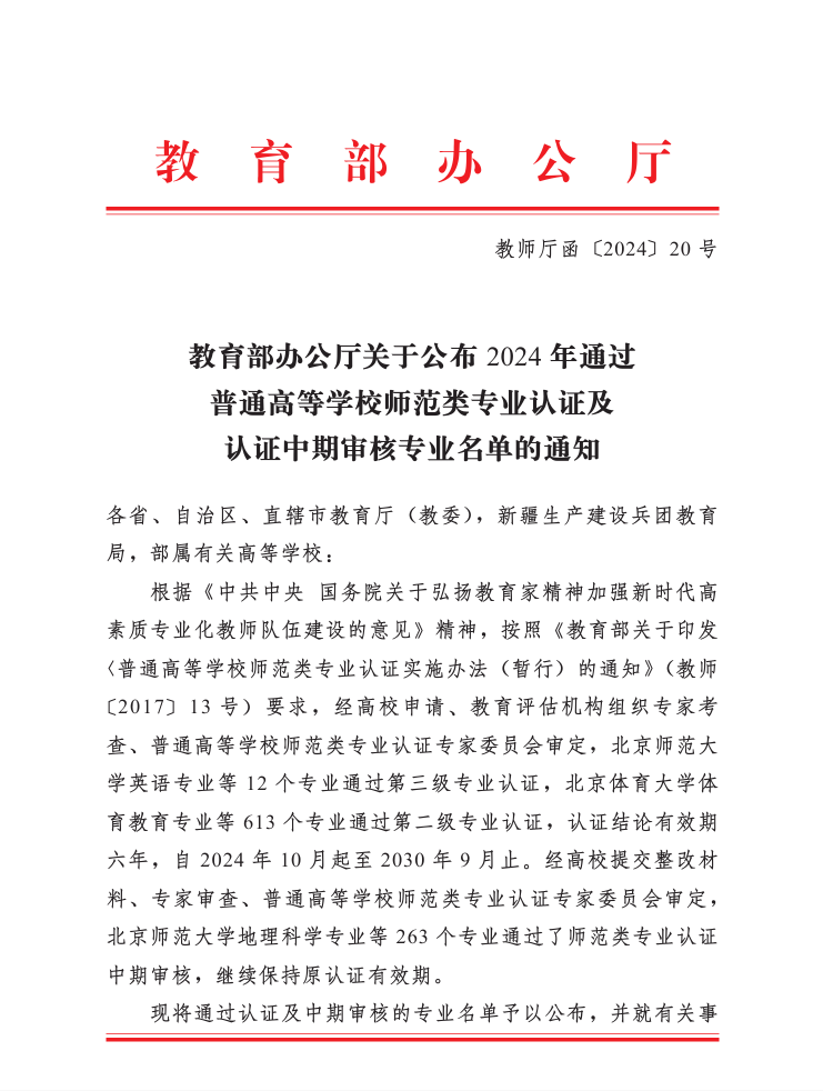 近日,教育部办公厅发布《关于公布2024年通过普通高等学校师范类专业认证及认证中期审核专业名单的通知》(教师厅函〔2024〕20号),我校小学教育、数学与应用数学2个专业通过教育部师范类专业第二级认证,认证结论有效期为2024年10月至2030年9月。