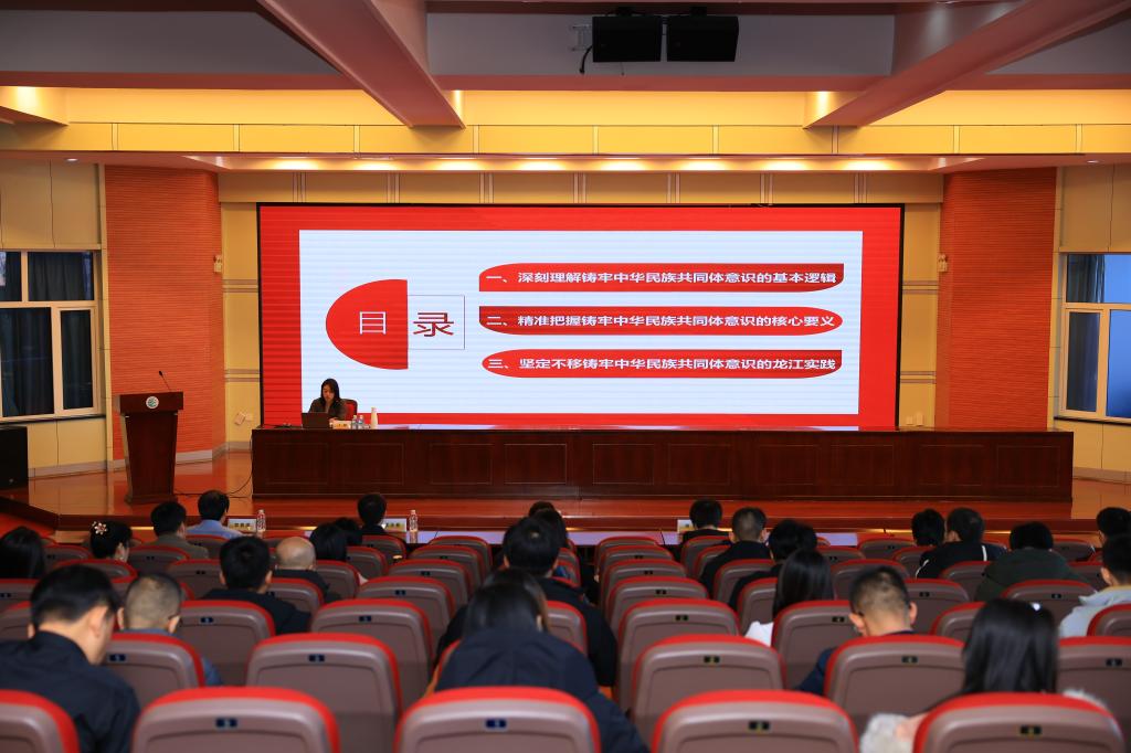 丁聪以《铸牢中华民族共同体意识理论与实践》为题,从深刻理解铸牢中华民族共同体意识的基本逻辑、精准把握铸牢中华民族共同体意识的核心要义、坚定不移铸牢中华民族共同体意识的龙江实践等三个方面进行了深入的讲解。讲座主题鲜明、内涵丰富、重点突出,为学校不断推进铸牢中华民族共同体意识教育提供了启发和借鉴。