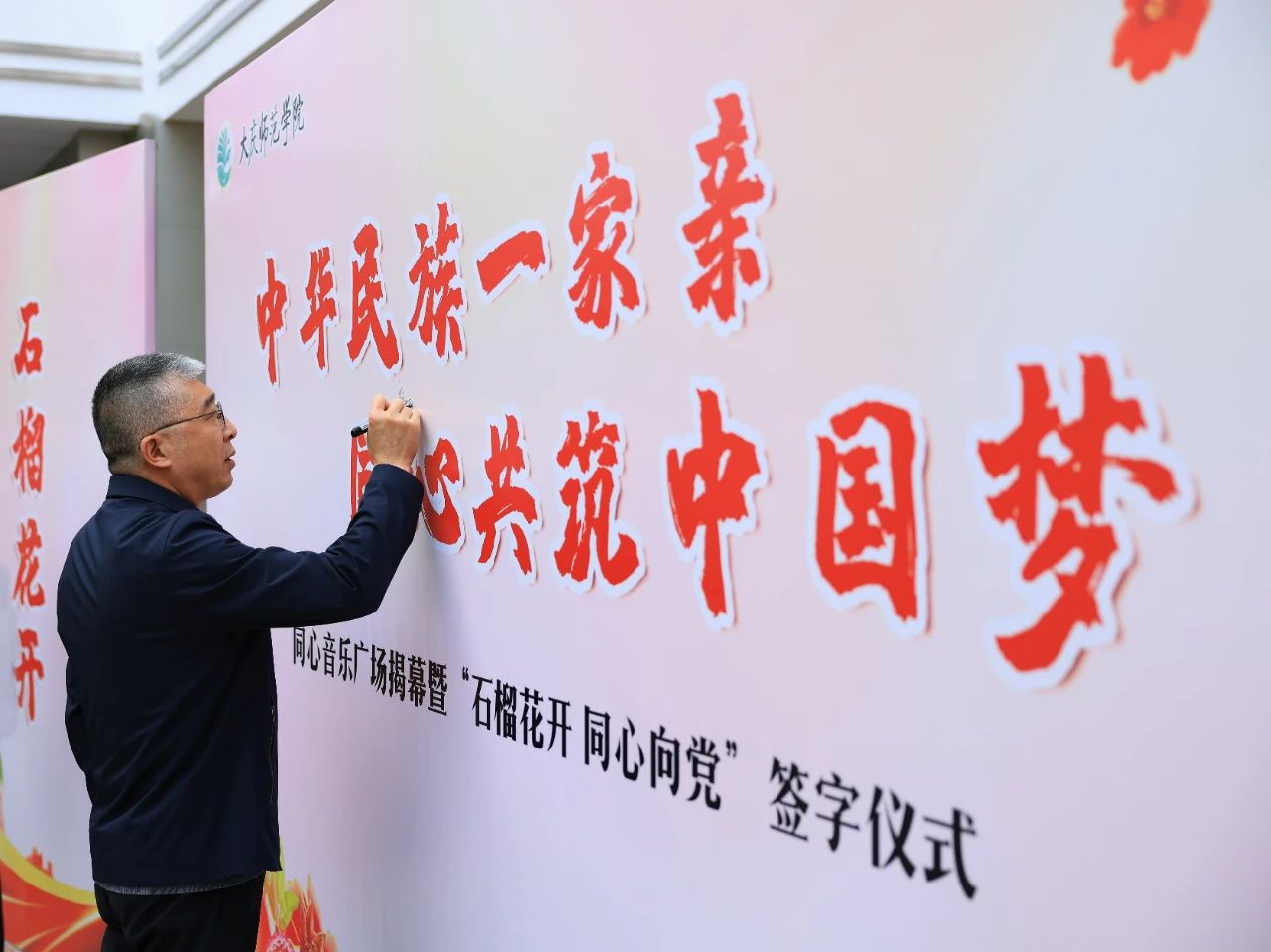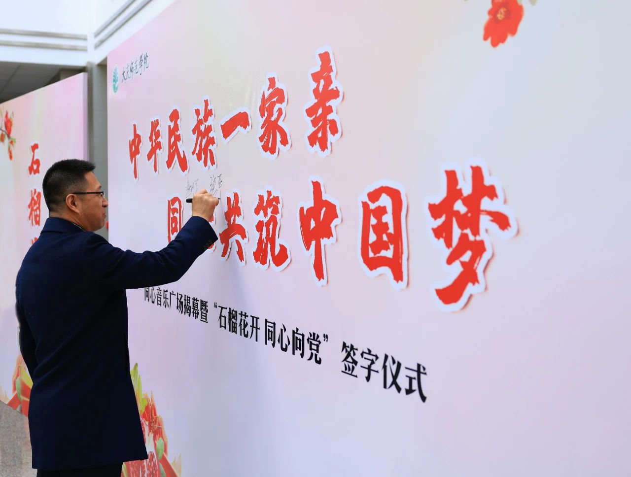 为了深入学习贯彻习近平总书记在全国民族团结进步表彰大会上的重要讲话精神,持续开展学校“石榴花开 同心向党”品牌活动,11月20日上午,学校举行了“同心音乐广场”揭幕仪式。省民宗委民族团结促进处处长丁聪、大庆市委统战部二级调研员季永春,学校党委书记赵科学、校长张平、党委副书记刘迪、副校长康忠伟、党委委员、宣传统战部部长郭春满,以及党群干部、师生代表参加了活动。