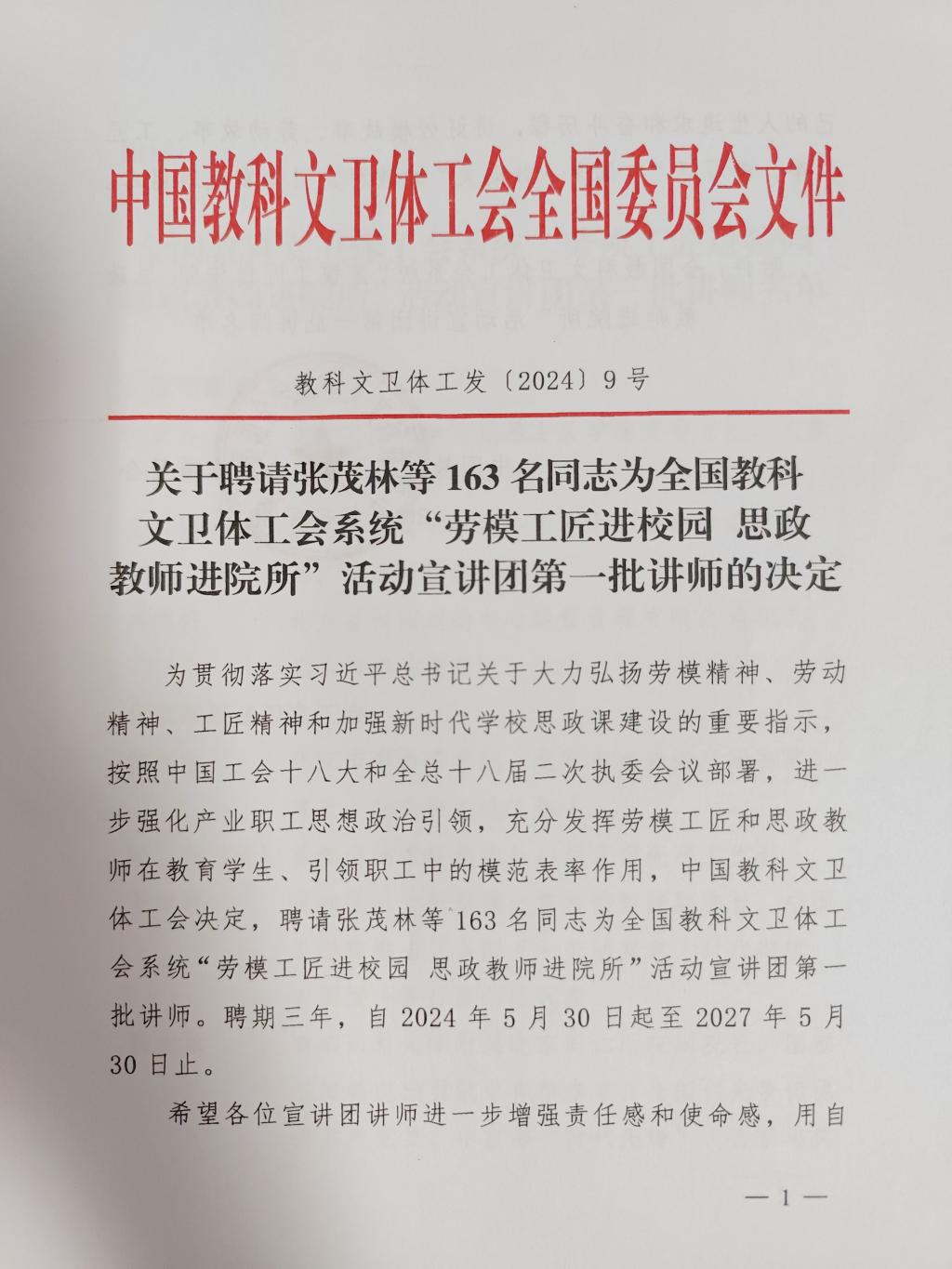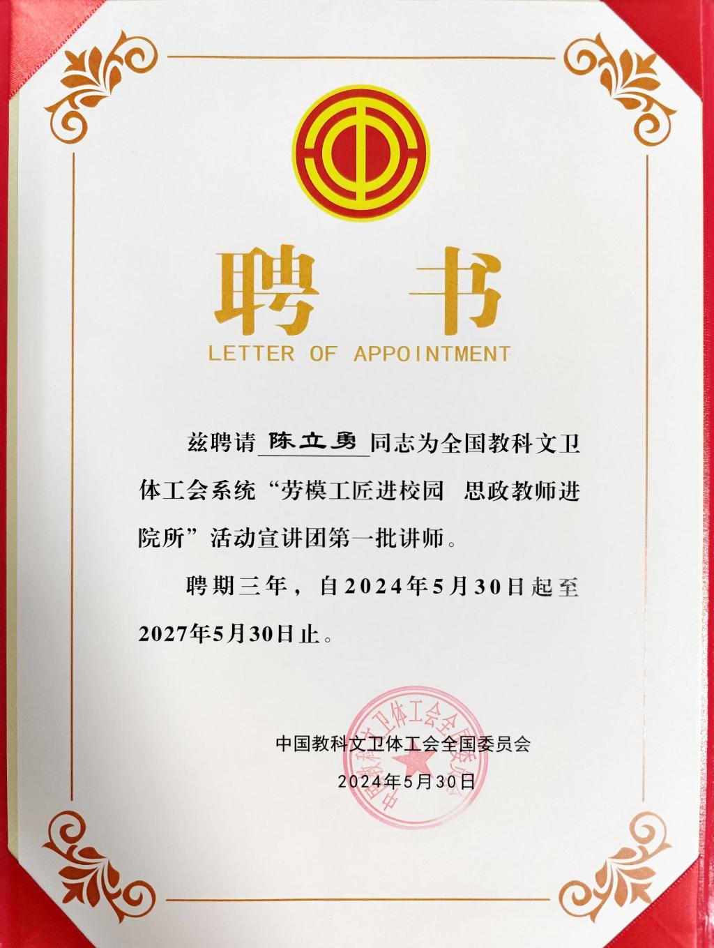 近日,我校陈立勇教授被聘为全国教科文卫体工会系统“劳模工匠进校园思政教师进院所”活动宣讲团第一批讲师。聘期三年,自2024年5月30日起至2027年5月30日止。