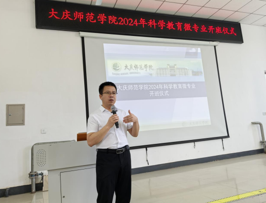 2024年8月27日,我校首个科学教育微专业开班仪式在教师教育学院六教阶梯教室举行。教务处处长张国发、副处长姜秀丽,教师教育学院教学临时负责人李锋,小学教育系主任曹海丽,微专业班主任迟艳辉,以及教师教育学院、机电工程学院、化学工程学院、生物工程学院、数学科学学院等5个学院六十余名学生参加了开班仪式。