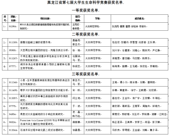 近日,第九届全国大学生生命科学竞赛(科学探究类)决赛获奖名单揭晓。生物工程学院参赛团队荣获国家二等奖1项,国家三等奖4项。在黑龙江省第七届大学生生命科学竞赛决赛中荣获一等奖1项、二等奖4项、三等奖7项,获奖数量取得“历史性突破”,同时获得优秀组织奖。