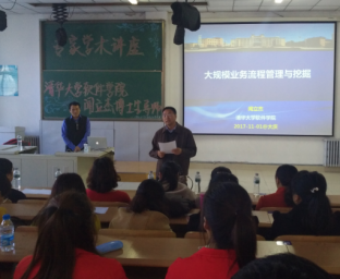 2017年11月1日下午,计算机学院邀请清华大学博士生导师闻立杰博士做《大规模过程数据管理与挖掘》专题讲座。本次讲座由计算机学院院长助理马英瑞老师主持,学院党总支书记徐媛、院长助理李宏博、全院骨干教师及2015级全体学生参加了座谈会。