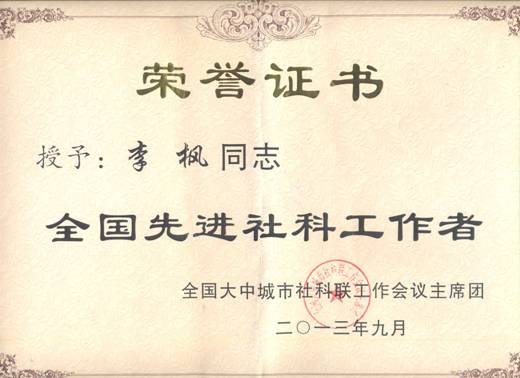 在2013年9月召开的全国大中城市社科联第二十四次工作会议上,我校文学院的李枫教授获得全国先进社科工作者称号。