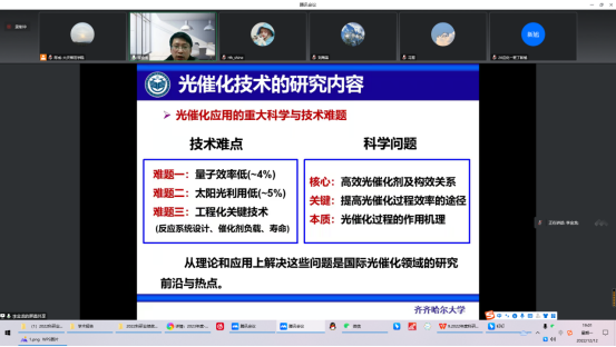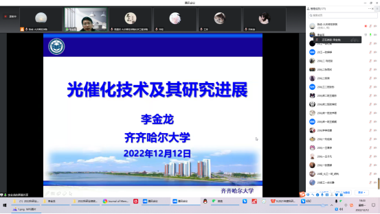 12月12日,应化学工程学院邀请,齐齐哈尔大学化学与化学工程学院院长李金龙教授作了题为《光催化技术及其研究进展》的线上学术报告,报告会由化学工程学院院长助理陈成主持,化学工程学院部分教师和学生200多人参会。