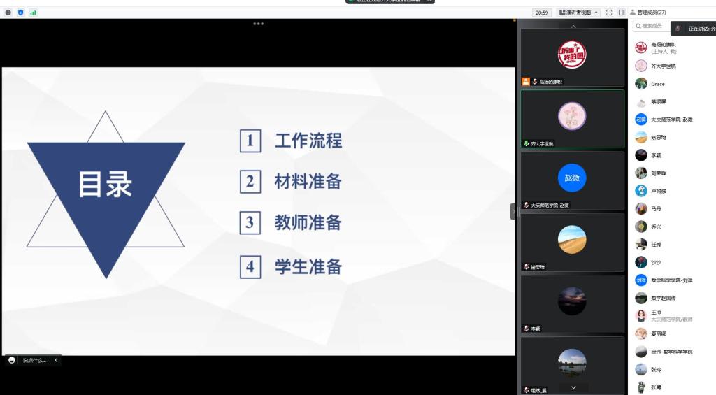 为进一步推动我校数学与应用数学专业的师范专业认证准备工作,加深数学科学学院全体教职工对师范专业认证体系的理解,10月21日晚,数学科学学院利用腾讯会议举办了师范专业认证培训会。本次培训会,特邀齐齐哈尔大学理学院副院长宇世航教授做认证专家进校考察阶段准备工作专题培训,数学科学学院行政负责人高扬教授主持培训会。数学科学学院领导班子全体成员、师范专业认证自评报告撰写组成员、全体专任教师、辅导员、教学秘书和行政干事参加会议。