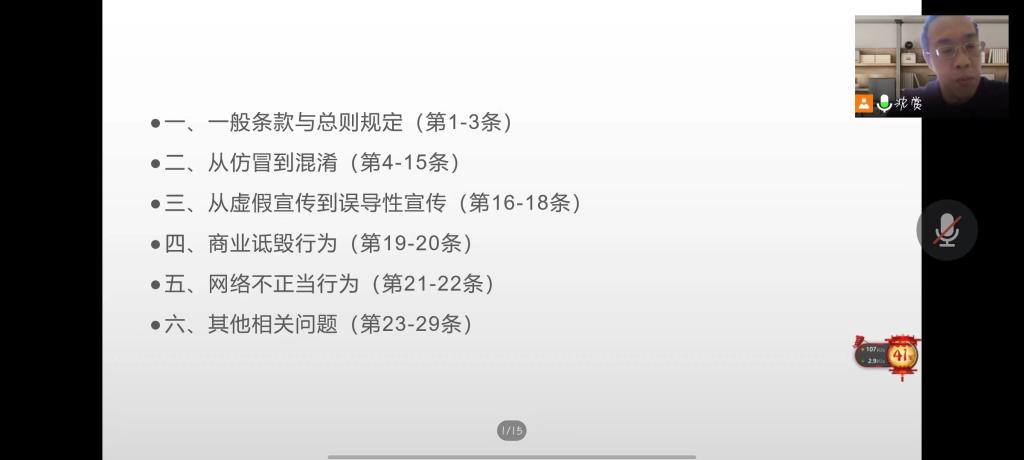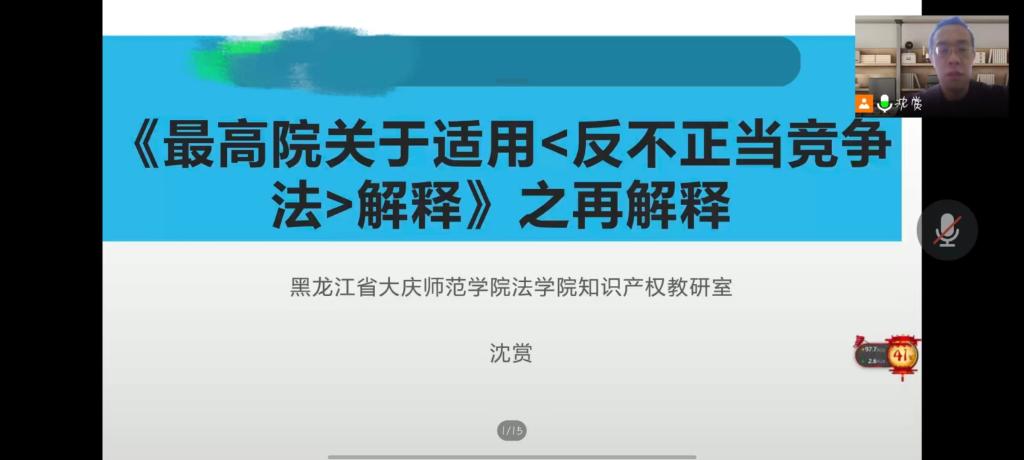 2022年4月22日下午两点,法学院“知识产权宣传周”系列活动中沈赏副教授主讲的“《最高院关于适用<反不正当竞争法>解释》之再解释”在腾讯会议平台举行。讲座围绕“一般条款与总则规定”、“从仿冒到混淆”、“从虚假宣传到误导性宣传”、“商业诋毁行为”、“网络不正当行为”、“其他相关问题”等六个方面展开,详细剖析了最高院关于适用《反不正当竞争法》的司法解释。讲座充分展现了沈赏副教授的扎实理论功底,讲座内容能够结合丰富生动的法律实践展开,受到与会人员的好评。
