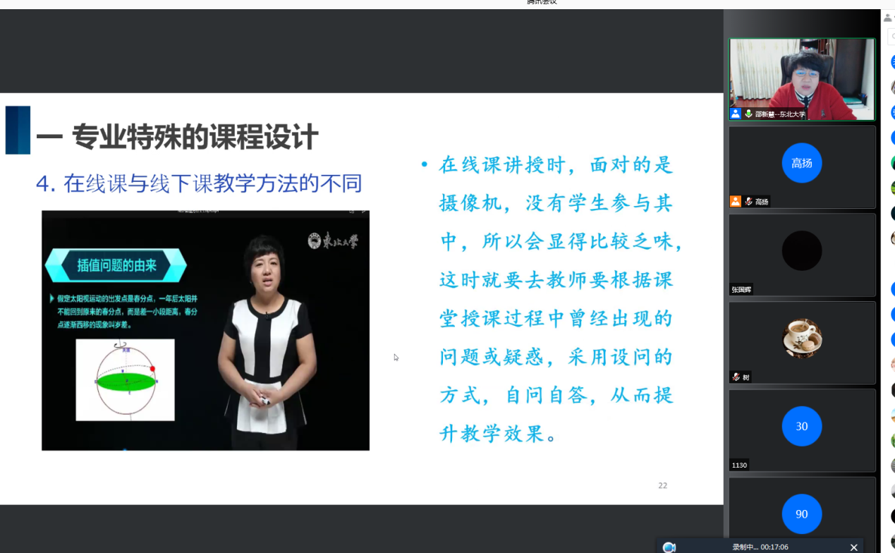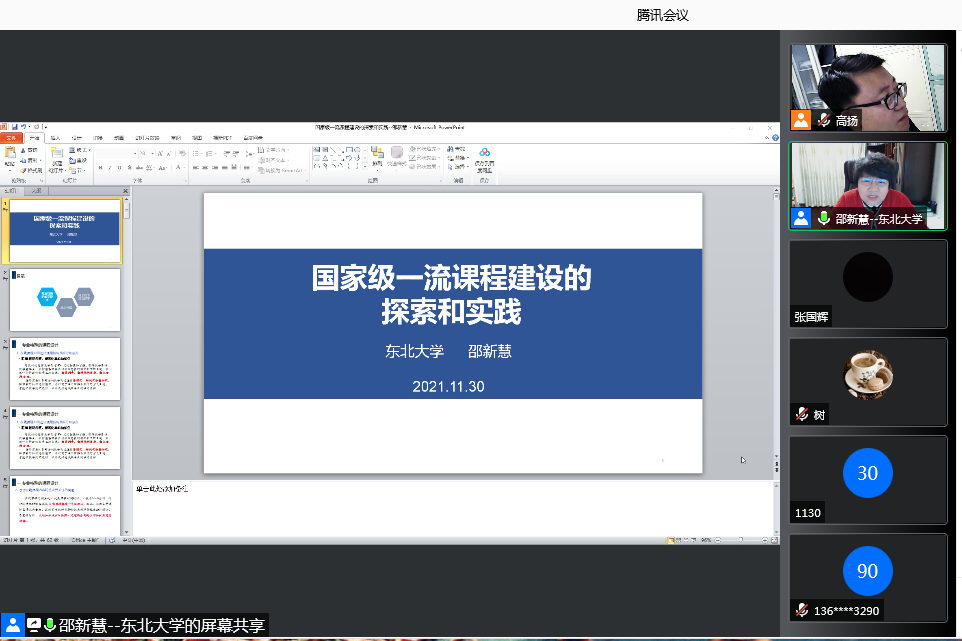 11月30日晚上18时30分,数学科学学院在腾讯会议线上举行课程建设专题报告会。本次报告会邀请东北大学理学院邵新慧教授,作题为“国家级一流课程建设的探索与实践”专题报告。报告会由副院长高扬主持,学院全体教师参加。