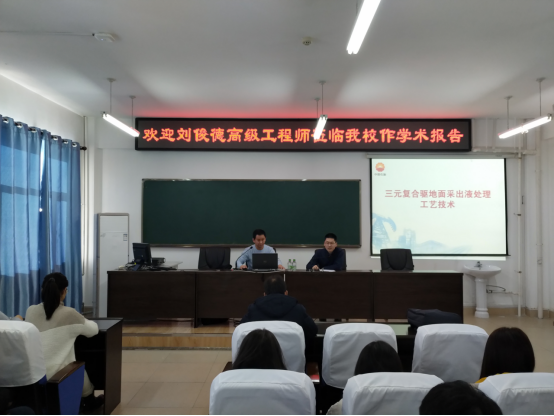 12月12日,应化学工程学院邀请,大庆油田第一采油厂试验大队副大队长、技术带头人刘俊德高工为全院师生作了《三元复合驱地面采出液处理工艺技术》的学术报告,报告会由化学工程学院高清河教授主持,学院全体师生认真聆听了报告。
