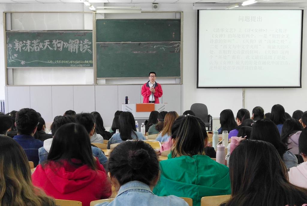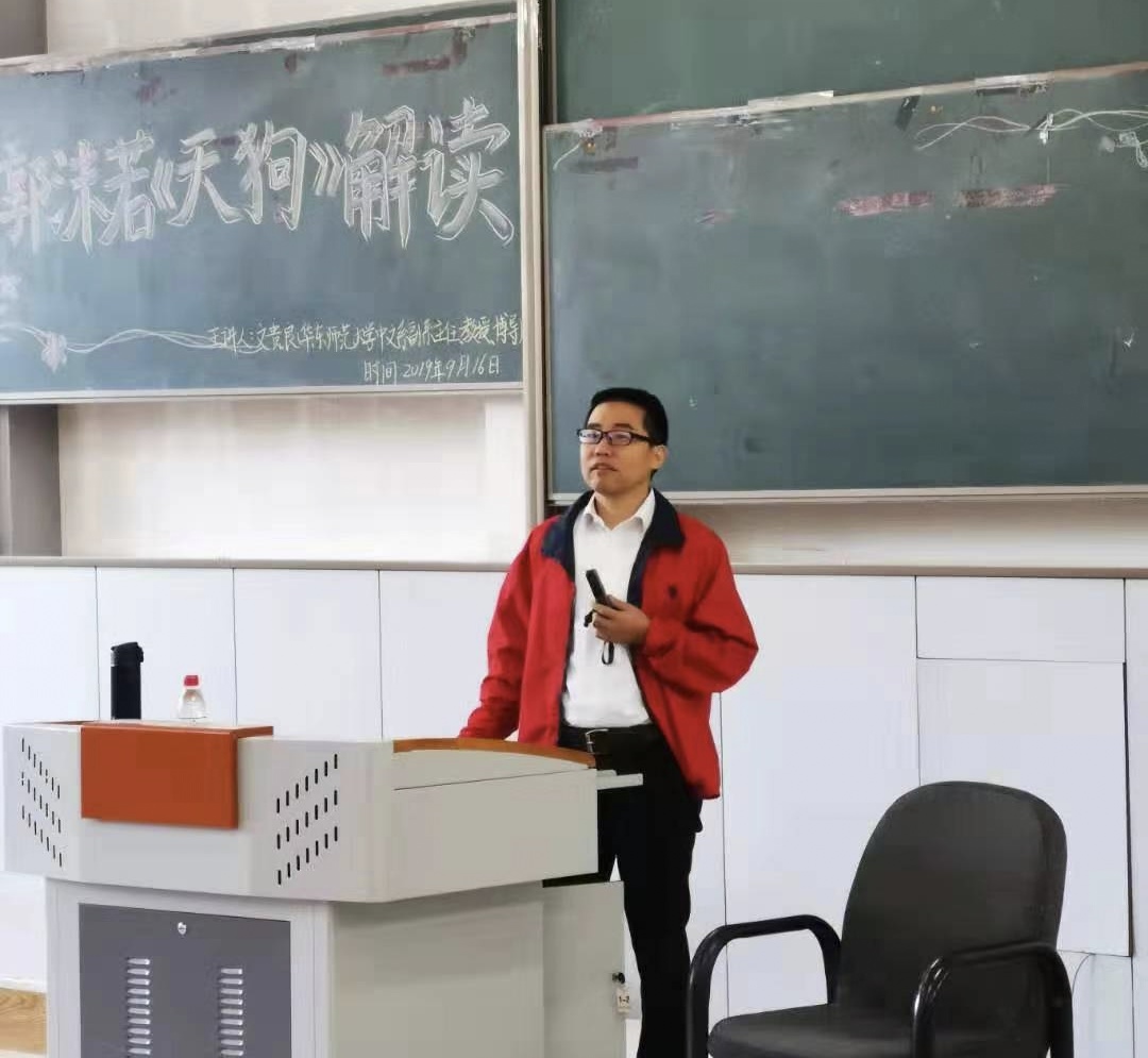 9月16日上午,文学院邀请华东师范大学中文系副系主任、博士生导师文贵良教授做了题为“郭沫若《天狗》解读”的学术讲座,文学院2017级汉语言文学、汉语国际教育专业全体学生聆听讲座。讲座由文学院院长助理原昊博士主持。
