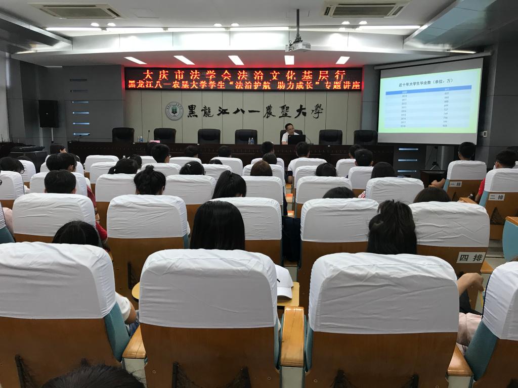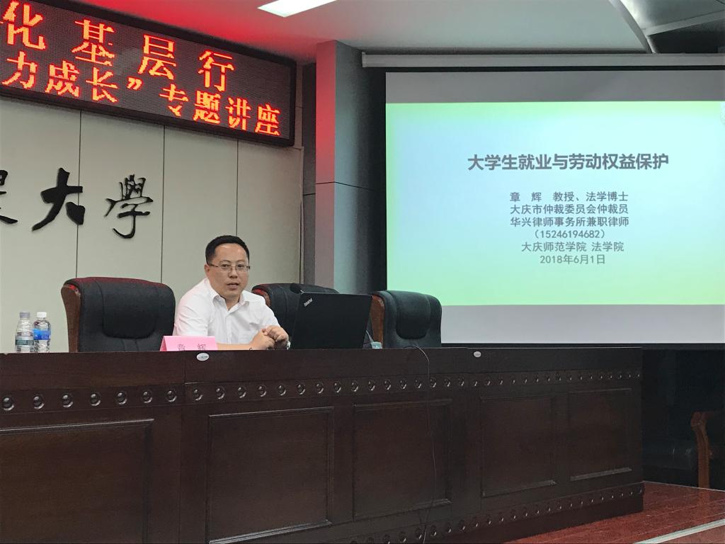 2018年6月1日晚,我院章辉教授应邀参加了大庆市法学会举办的法治文化基层行活动,并在黑龙江八一农垦大学主楼1043会议室为同学们作了题为“大学生就业与劳动权益保护”的专题讲座。讲座内容主要围绕《劳动法》、《劳动合同法》、《劳动争议调解仲裁法》、《劳动合同法实施条例》等重要劳动法律法规展开,重点讲解和分析了就业协议与劳动合同的关系,劳动合同必备条款,劳动合同效力,劳动者应有权利,劳动合同试用期约定,劳动合同解除权规定,经济补偿金和赔偿金,违约金制度设计,劳动争议范围,以及劳动仲裁和诉讼的衔接等15个同学们关心和关注的问题。
