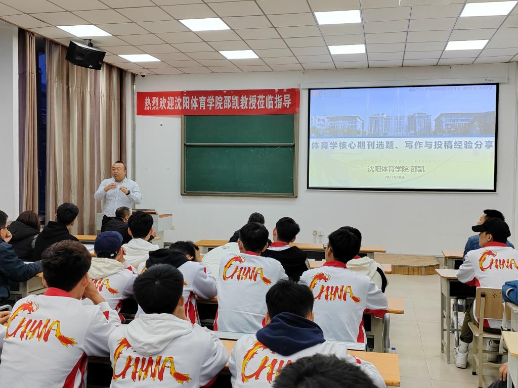 邵凯教授以“体育学核心期刊选题、写作与投稿经验分享”为主题,从体育学论文选题的整体环境与要求;体育学论文选题的主要分类;体育学论文选题的蓝海;如何形成一个良好的论文题目;体育学论文核心期刊所要求的写作技巧;邵凯教授多年来的中文体育类核心期刊发表过程经验分享等几个方面进行精彩讲解与分享。邵凯教授的讲座使体育学院师生进一步学习领会了体育学核心期刊选题与撰写方法,为师生在撰写论文方面提供了经验、指导及新的思路,针对参会师生提出的问题,开展了积极的研究讨论。(撰稿:孙波 审核:邵长坤 编辑:姜丰翼)