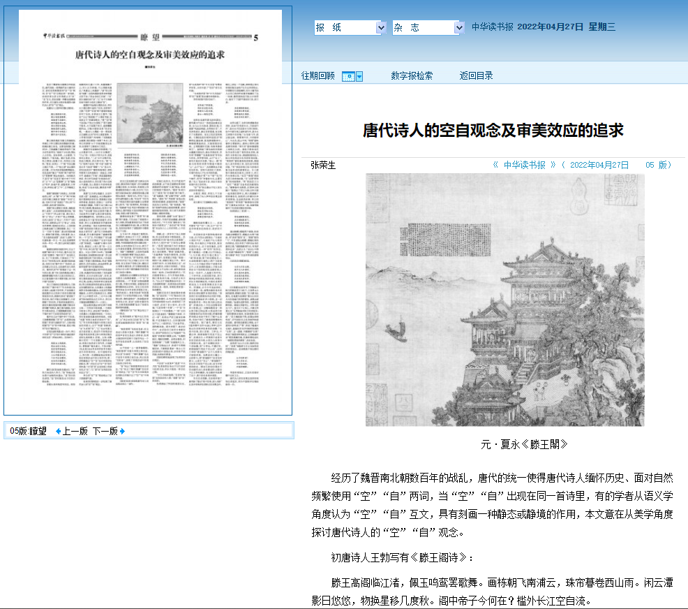 日前,我校文学院退休教师张荣生教授撰写的论文“唐代诗人的空自观念及审美效应的追求”先后被光明网、澎湃网作为重点文章全文转载。整版刊于光明日报报业集团主办的《中华读书报》2022年4月27日第5版,引起文艺评论界广泛关注。
