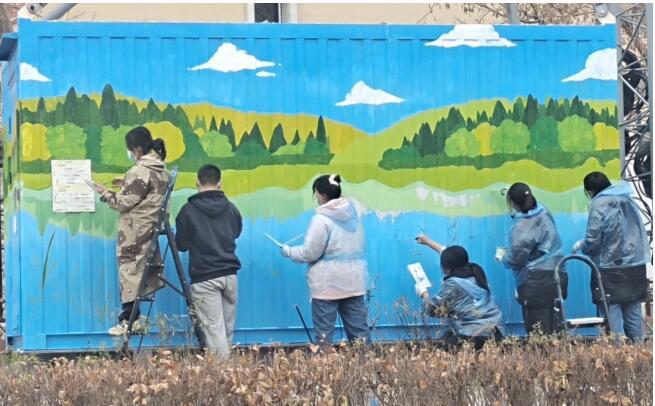 学伟鑫城西侧,远远就能看到一大幅山水画,6个大学生正拿着画板现场作画,一个女学生站在梯子上,给画作最上面的森林上色,大家不时地相互商量着。