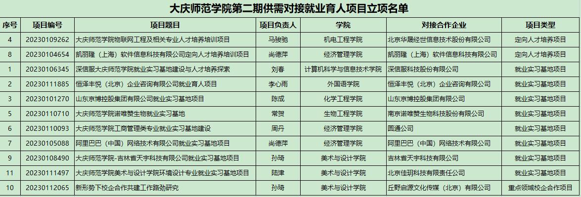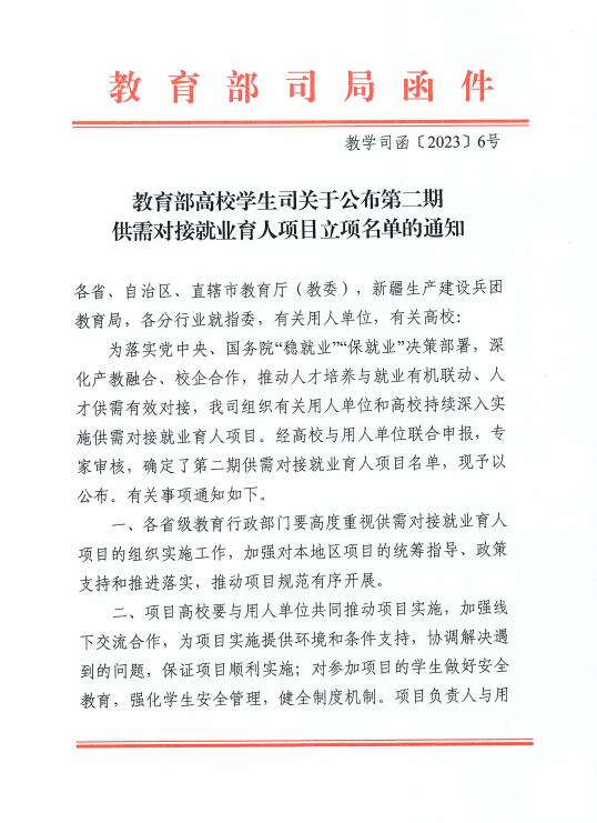 2023年4月6日,教育部高校学生司发布《关于公布第二期供需对接就业育人项目立项名单的通知》,学校11个供需对接就业育人项目获批立项,其中重点领域校企合作项目1个、定向人才培养项目2个、就业实习基地项目8个。