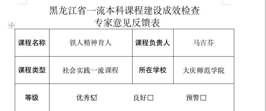 日前,全省一流本科课程建设成效检查结果公布,《铁人精神育人》国家社会实践一流课程建设成效检查结果获评优秀等级(典型案例)。此次全省共有243门一流本科课程接受建设成效检查,确定优秀73门(典型案例50门)、良好153门、预警17门。