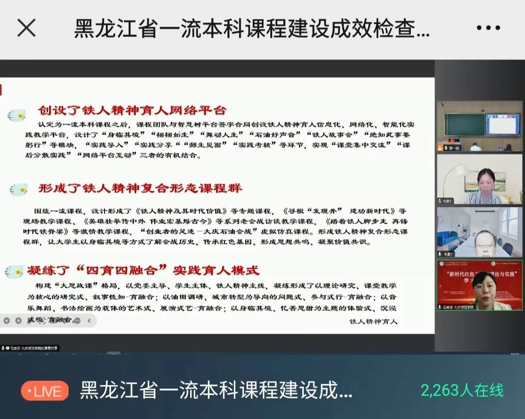 《铁人精神育人》国家社会实践一流课程负责人马吉芬教授代表课程团队,从基本情况、课程内容、资源建设、具体案例、考评方式、特色创新等方面作了现场汇报,得到与会专家高度认可,并从更新案例、以课促赛、辐射全国、扩大影响等方面就后续课程建设给予指导意见。