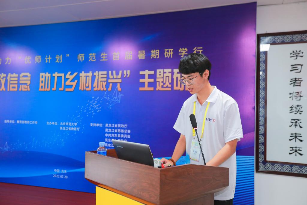 在最后一天的“坚定从教信念 助力乡村振兴”主体研讨会上,每所高校各有一名学生做此次研学行的心得分享,来自我校文学院的郭志超同学的报告名为“坚定耕耘教坛志向抱负、助力乡村振兴”,他说:“教育是有力量的。乡村教育振兴这条路,注定是艰苦的,也是孤独的。”可见,他已经做好了心理建设,来迎接未来的各种困难和挑战。